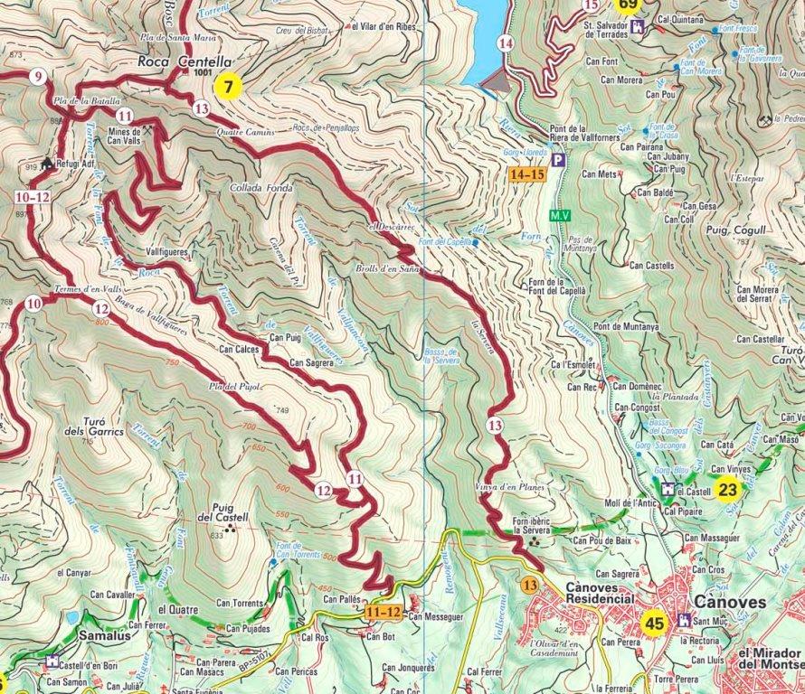 Punt d’arribada: Al mateix punt de partida, tot pujant per la MINA DE CAN VALLS, fins a la ROCA CENTELLA, cim de 1.001 metres d’alçada, i baixant per propi SERRAT LLARG.