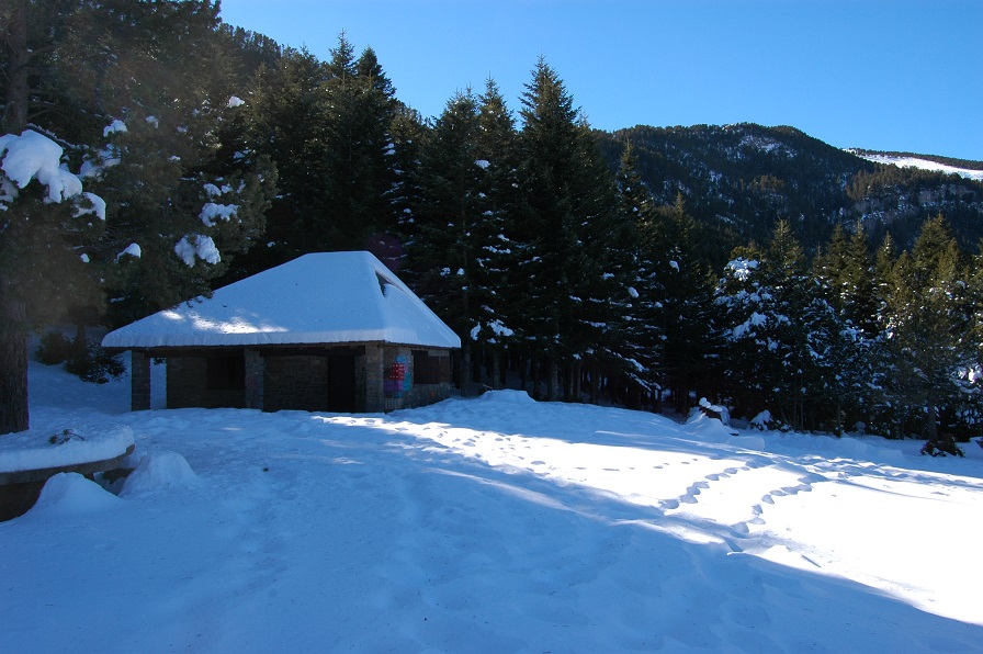 Comptem també amb l’auxili de dos refugis lliures que poden proporcionar-nos un fraccionament voluntari de l’excursió i la possibilitat de passar una nit hivernal a bon resguard, en mig de boscos de coníferes d’aparença nòrdica. Dels dos refugis que hi trobem a l’excursió, un es gran i està bastant ben conservat, el del Pla de Prats. L’altre, més amunt i isolat, es més precari i, malauradament, està completament guixat per dintre, ple de noms escrits a les parets i dibuixos fets amb mala traça, testimoni que, per desgràcia, no tots els brètols es queden a la terra baixa.