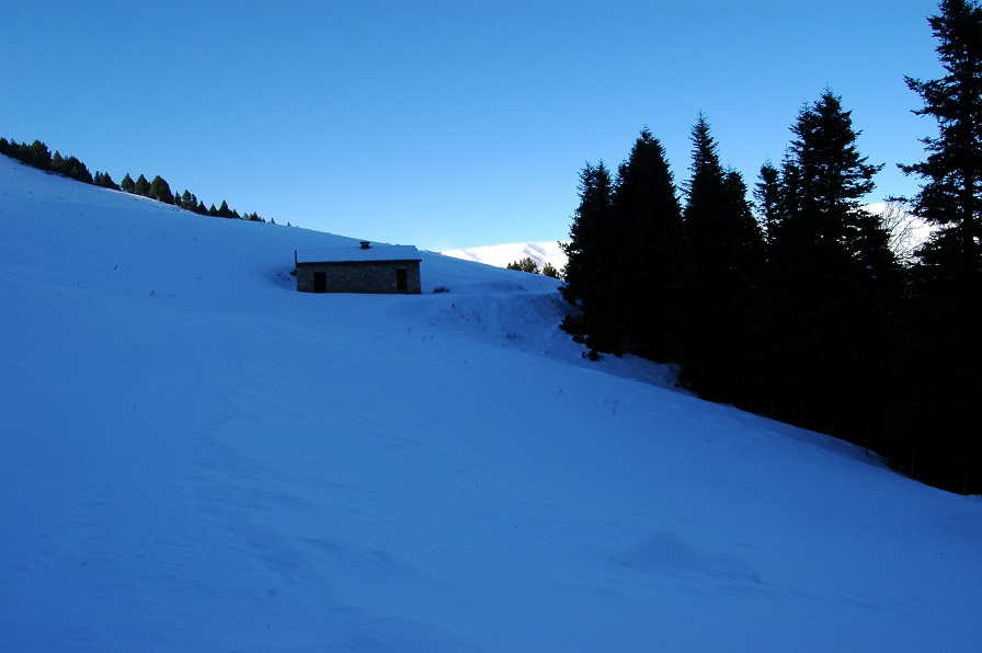 1,50 h. Nova bifurcació. Seguim ara vers a l’esquerra pel camí que puja de manera directa vers al sud. Taques gorgues. Ara be un tram on la pista ja ha donat pas a un camí mes estret i que guanya alçada de manera més decidida i mitjançant ziga zagues. Malgrat que ja no estem en una pista relativament ample, el camí resulta evident malgrat que la neu pugui ser abundant.