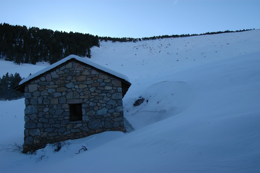 2,35 h. Refugi de la Covil, 1.779 metres. De cop hi volta el bosc s’obre per deixar pas a un ras molt marcat i evident a ple vessant nord que serà la pujada més directa vers al cim. Pujarem per l’indret on considerem més convenient, tot depenent de l’estat de la neu, essent més aconsellable anar-hi per qualsevol dels dos marges d’aquesta gran pala. Si anem pel marge esquerra anirem a parar més a prop del cim. El ras conclou en una poc concentrada línia d’arbres que es el preludi de l’aresta del cim.
