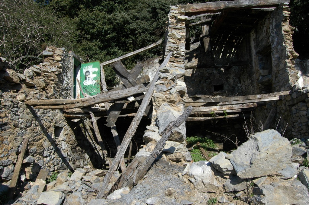 1,30 h. Runes del Mas de las Figuera. Passem per davant de les runes indret on el camí en transforma en un corriol que va a parar al peu de les cingles situades sobre el que resta de construcció, per anar pujant després pel ben mig de bosc, dibuixant ziga zagues en la pronunciada pendent, en tendència vers al N.E. Taques grogues i algun tram amb fites.