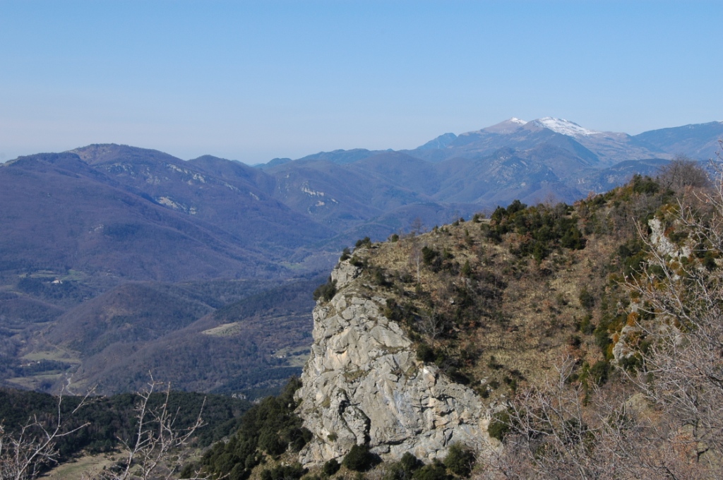 3,15 h. Cim del Comanegra. 1.557 metres. Sostre de l’Alta Garrotxa. Curiosament els arbres no permeten una bona panoràmica des del cim, si anem a la cota secundaria situada 2 minuts més a l’oest, solucionarem el problema de la manca de perspectiva.