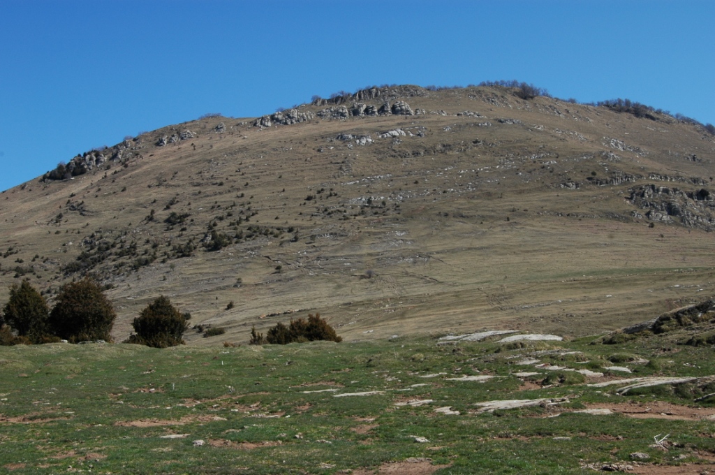 2,45 h. Coll Ferriol. Traspassem una ample pista i tot seguit encarem la pujada vers al cim, ja ben visible, per guanyar les darreres i llargues pendents herboses. Cartell indicador. En aquest punt abandonem les taques de color grog per continuar les taques vermelles i verdes. El camí, un xic discontinu, puja primer a ple vessant vers al nord i després comença descrivint una llarga travessia diagonal ascendent vers a la dreta, o sigui, vers a l’est. Quan passem per sota el cim tenim dos alternatives. La primera consisteix en abandonar el camí i pujar directament pel vessant obert d’herba i de pendent pronunciada vers a l’aresta situada a pocs metres del cim. La segona consisteix en continuar el camí fins al marge de una mena d’aresta que es després al sud del cordal principal i continuar a plena cadena vers a l’oest per coronar el cim. Aquesta segona opció es més còmoda però comporta 5 minuts més de marxa.