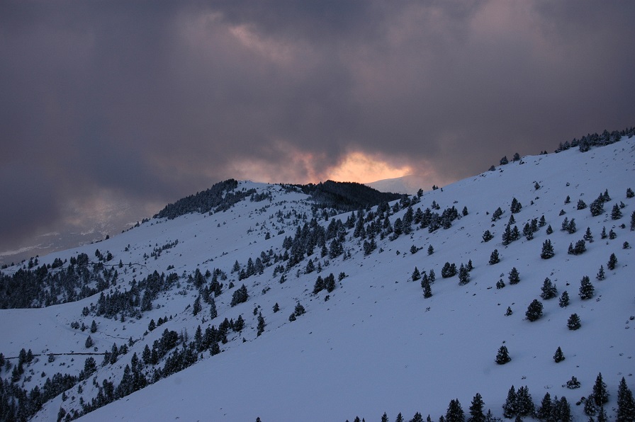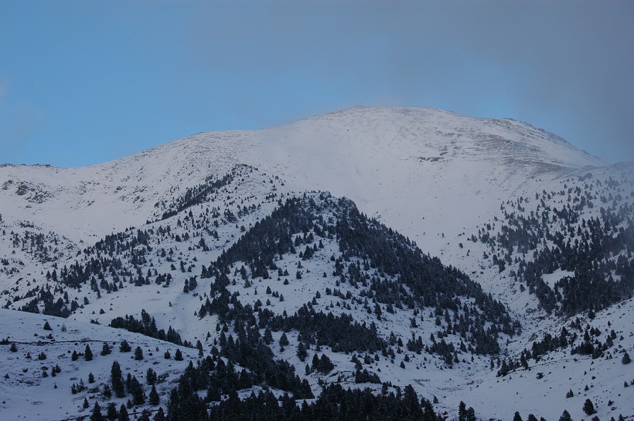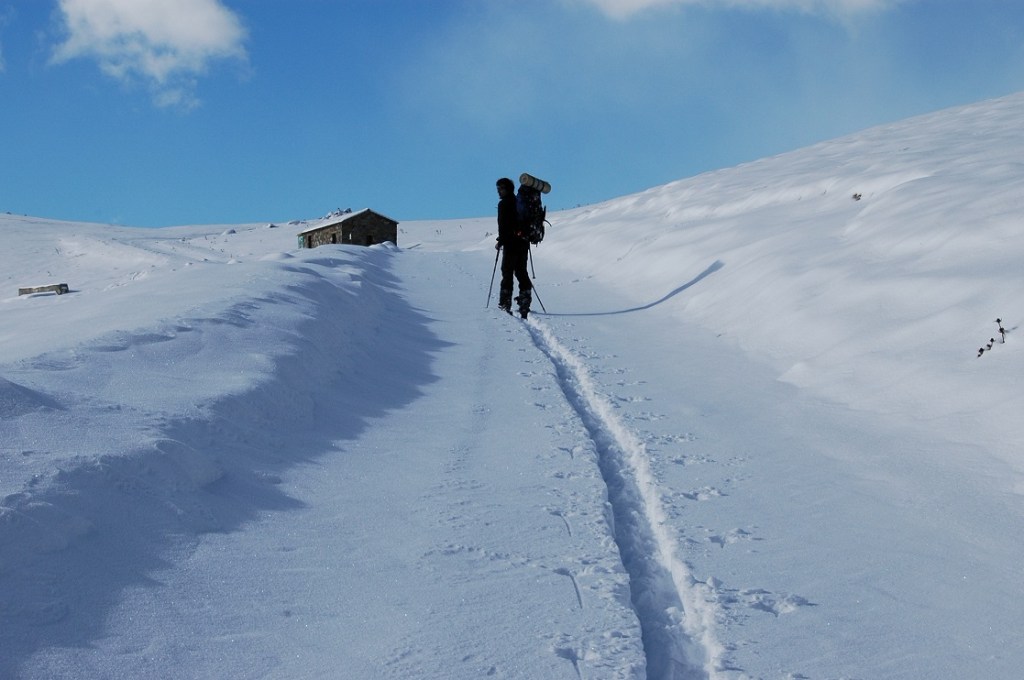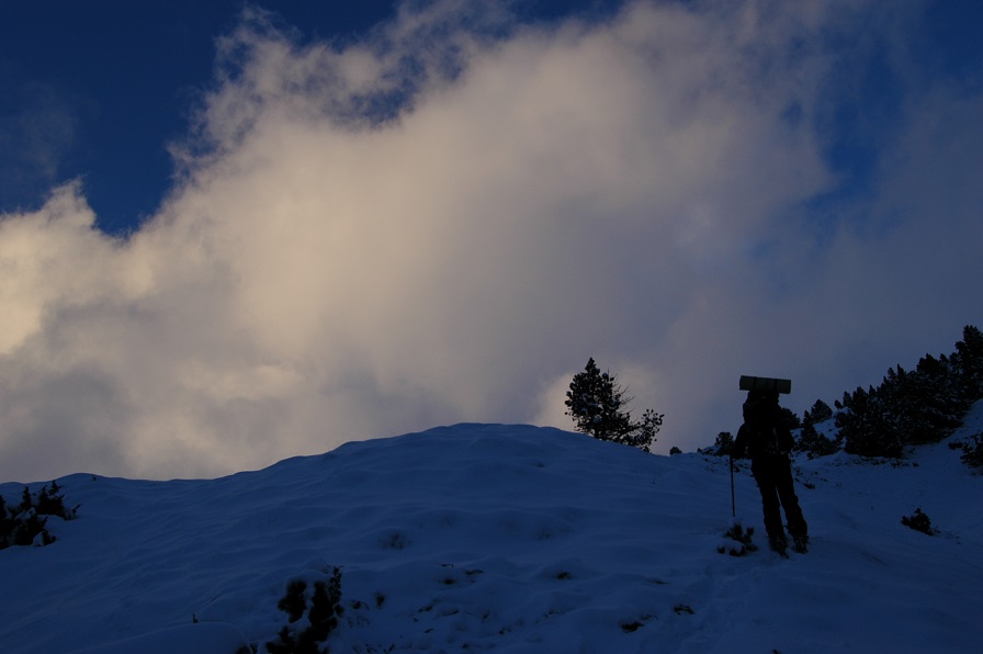 Descripció itinerari: Des del Xalet – Refugi del Coll de Pal, 1.925 metres, cal pujar vers a la carretera situada ben be per sobre, seguir l’asfalt uns quans metres vers a l’est i buscar una ample pista que puja en diagonal per la part dreta de la carretera i que s’orienta vers a l’oest tot guanyant alçada de manera molt suau. Marques de GR. Traspassem la Collada de la Bòfia, a 1.984 metres d’alçada, continuem flanquejant per la pista, ara en tendència descendent vers a l’oest fins flanquejar per sota l’anomena’t Roc Negre i entrar ja de ple al vessant obac on la neu, a l’hivern, ja està més que assegurada. Al revolt de la pista on hi ha el canvi d’orientació del vessant es localitzen les antigues explotacions de mines de la Barita. Una vegada passat el revolt hi trobem un camí de abandona la pista i segueix per la dreta en sentit ascendent, tot endinsant-se al bosc. Es la ruta del trencapinyes, senyalitzada amb taques de pintura de color vermelles i grogues rètol que ens indica que estem en el camí de pujada a la Tossa d’Alp i es per aquest camí ascendent per on haurem de continuar l’excursió.