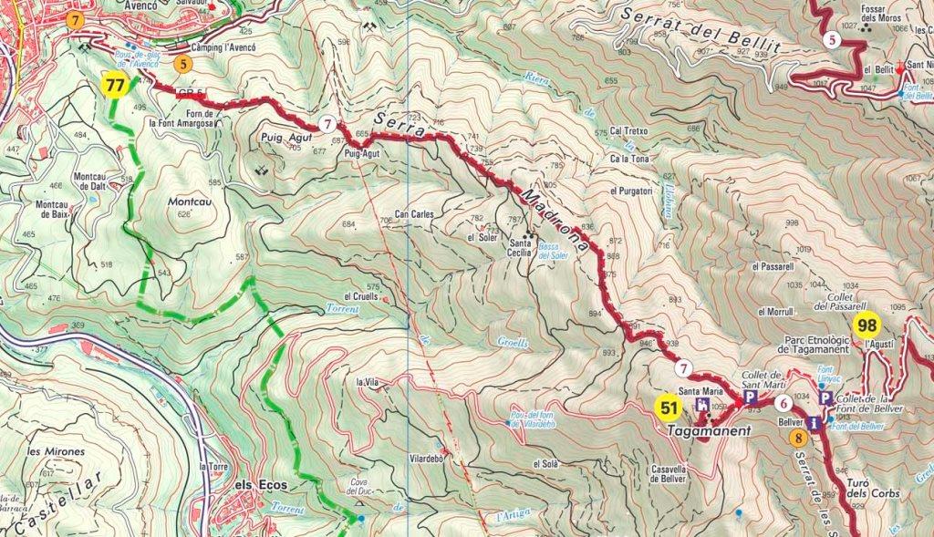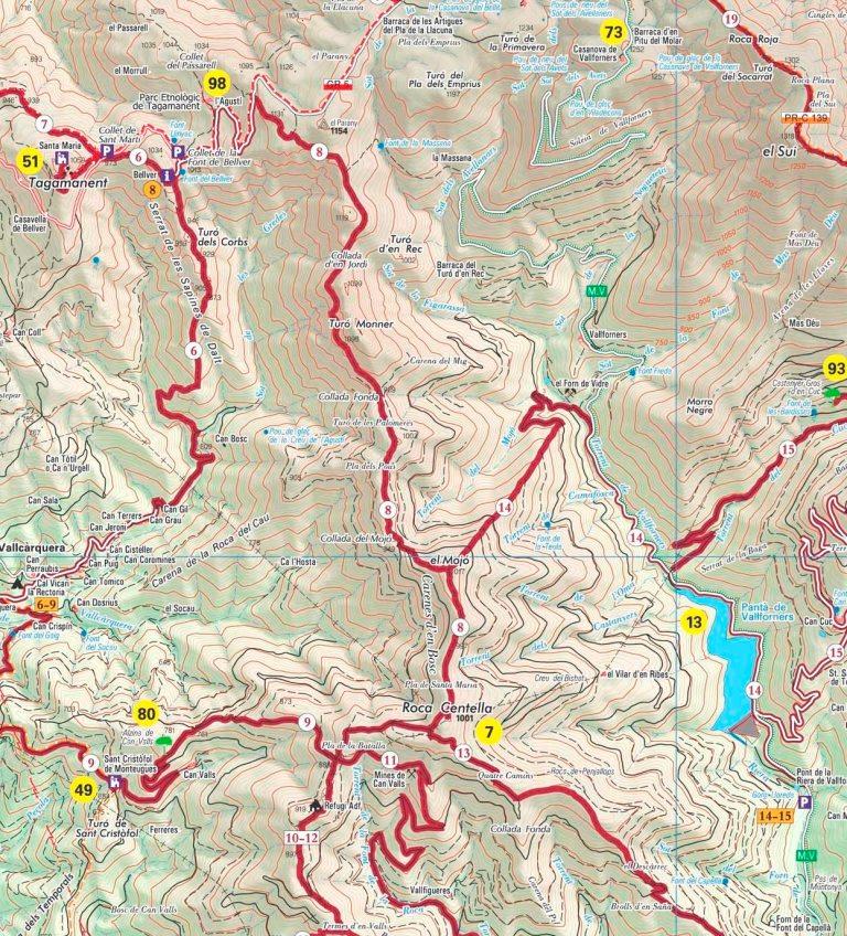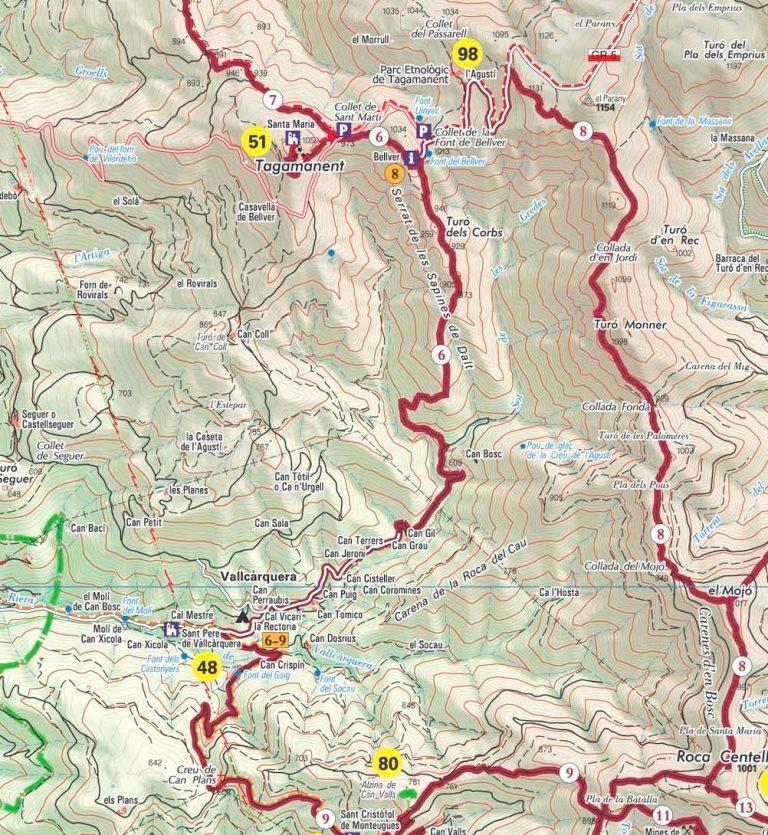 El camí puja de manera decidida pel mig del bosc i a la part intermèdia i alta transcorre de ple pel dors del TURÓ DELS CORBS, que es tracta d’una petita cota de 959 metres situada a la part alta de la pujada. Just a la part final el paisatge s’obre, sense que ens abandoni el bosc, però la pròpia aresta presenta grenys rocallosos que fa que les vistes siguin més amples. L’aresta, sempre ample, boscosa i amb camí marcat, va a parar al prats situats sota mateix de la masia de BELLVER, ben visible davant nostra. 1.000 m. (1,30 h). Des de la masia – restaurant prendrem el camí situat davant del portal i que es dirigeix en direcció N.O. cap al ben visible Tagamanent, fent una suau baixada arribem al COLLET DE SANT MARTÍ, 973 m. (1,40 h) amb les runes de l’ermita homònima. Hi trobem l’ample pista que prové de l’altre extrem de la CALMA. Al mateix coll deixem de banda la pista per prendre el corriol senyalitzat que, en direcció oest, enfila els prats situats al peu de les muralles del cim. Passem pel costat d’una senyal on ens anuncia el perill d’esllavissades. El camí no te pèrdua i esta senyalitzat. Traça una línia lleugerament ascendent que volta al peu de les cingles, fins a un trencall on canviarem radicalment la direcció de la nostra marxa. Continuem pujant fins a les esplanades del cim del TAGAMANENT. 1.059 metres. Runes de l’església de SANTA MARIA. (2,00 h)