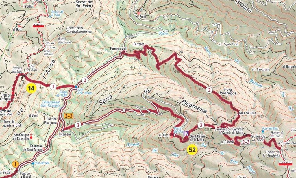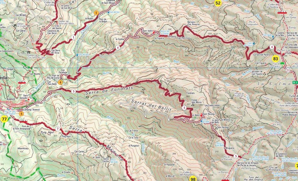 Punts de referència: * CAMPING L’AVENÇÓ CARENA DE FONDRATS DEL GRAU * COLL DE SAIOLS * SOT DEL BELLIT * FOSSAR DELS MOROS * FONT DEL BELLIT * MAS DEL BELLIT * SANT NICOLAU * SANT NICOLAU * PLA DE LA LLACUNA.