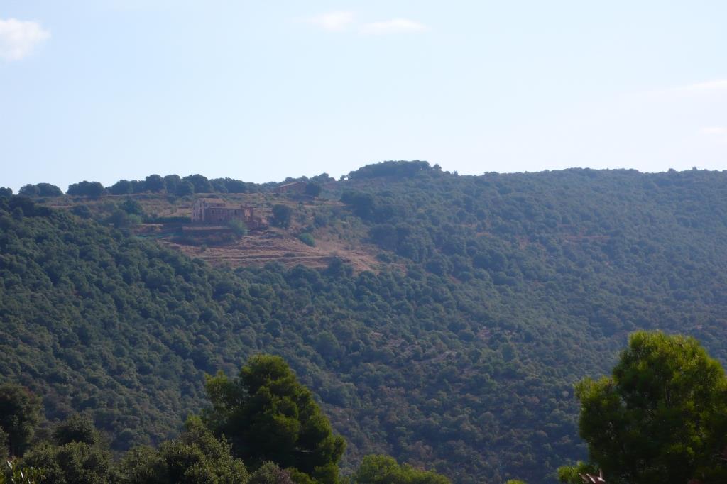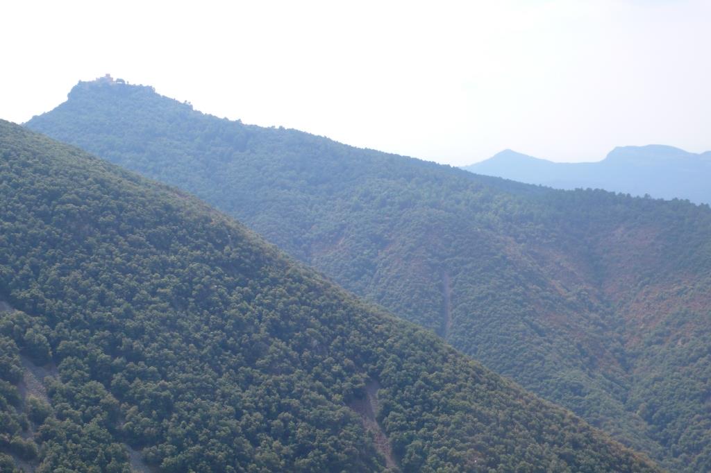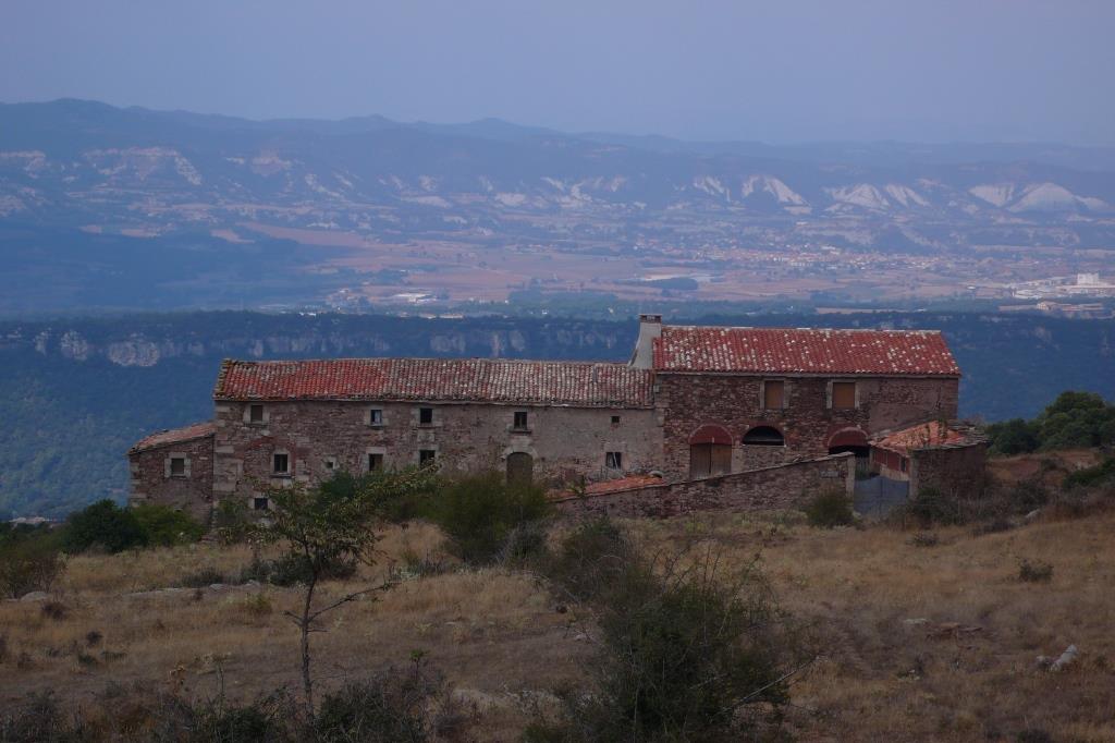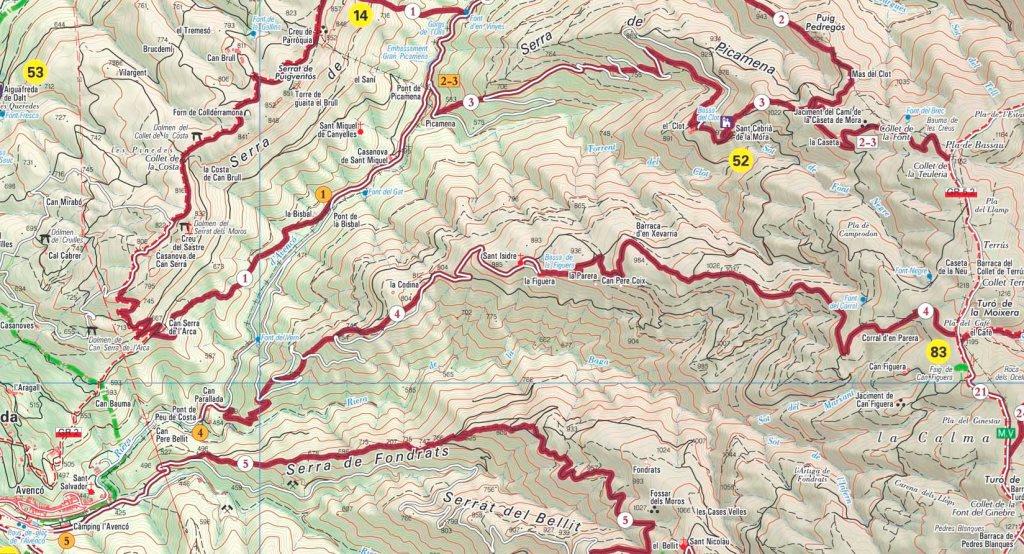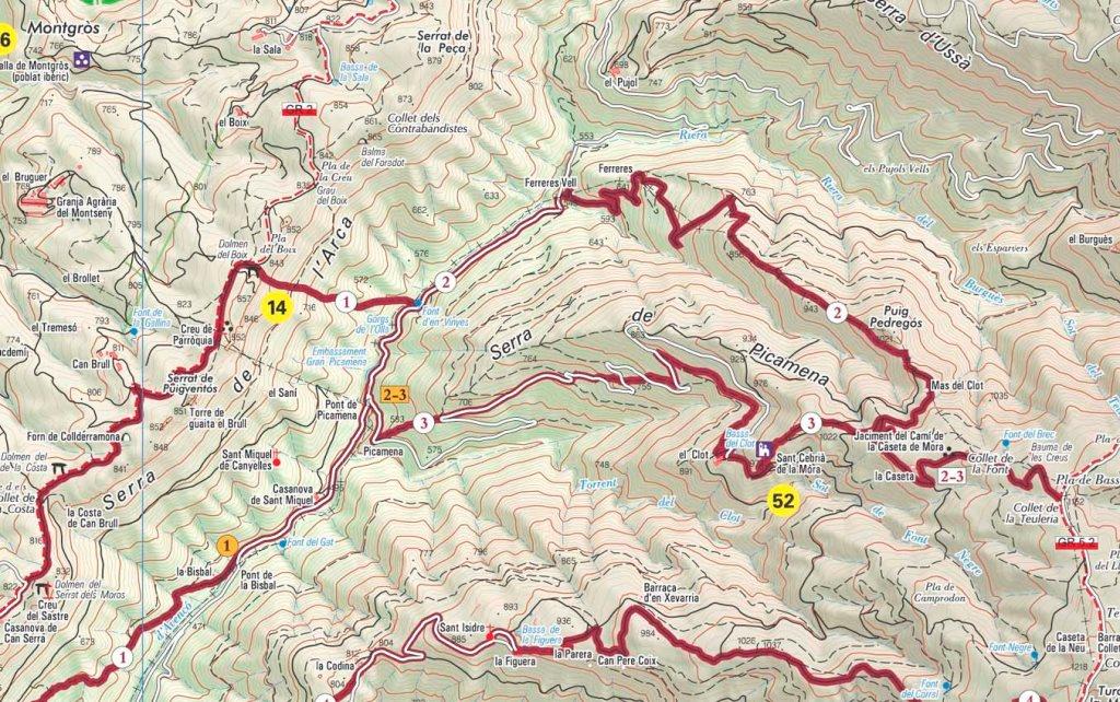 Itinerari: La mateixa pista que ens ha dut a les portes del càmping continua força ample, ja que es la via d’accés a les canteres. Es tracta d’una pista tan ample com una carretera i coberta sempre d’un llit de un o dos dits de pols. Quan ja transit de camions cap a la cantera la situació es força desagradable, pels grans aixecaments de pols que genera el transit de vehicles pesats. Al 5 minuts trobem una primera bifurcació cap a un cantera o cap a un altre, nosaltres prenem els trencall de l’esquerra que es el que es desprèn en direcció a la cantera Jaume Vila. Continuem l’ample pista que dibuixa un gran revolt. Quan portem 15 minuts de marxa i trobarem un trencall que surt del marge esquerra de l’ample pista. Es tracta d’un camí ben marcat que al poc sembla una pista abandonada. Nou trencall cap a la dreta, fita indicativa (0,25 h). El camí que surt d’aquí te taques grogues i puja directa pel mig del bosc fins a pujar dalt de la cadena. Passem uns grenys de roca, el terreny es boscós però de vegades presenta trams oberts amb bones panoràmiques. Els grenys de roca no presenten mai la més mínima dificultat. Camí fressat. Taques grogues.