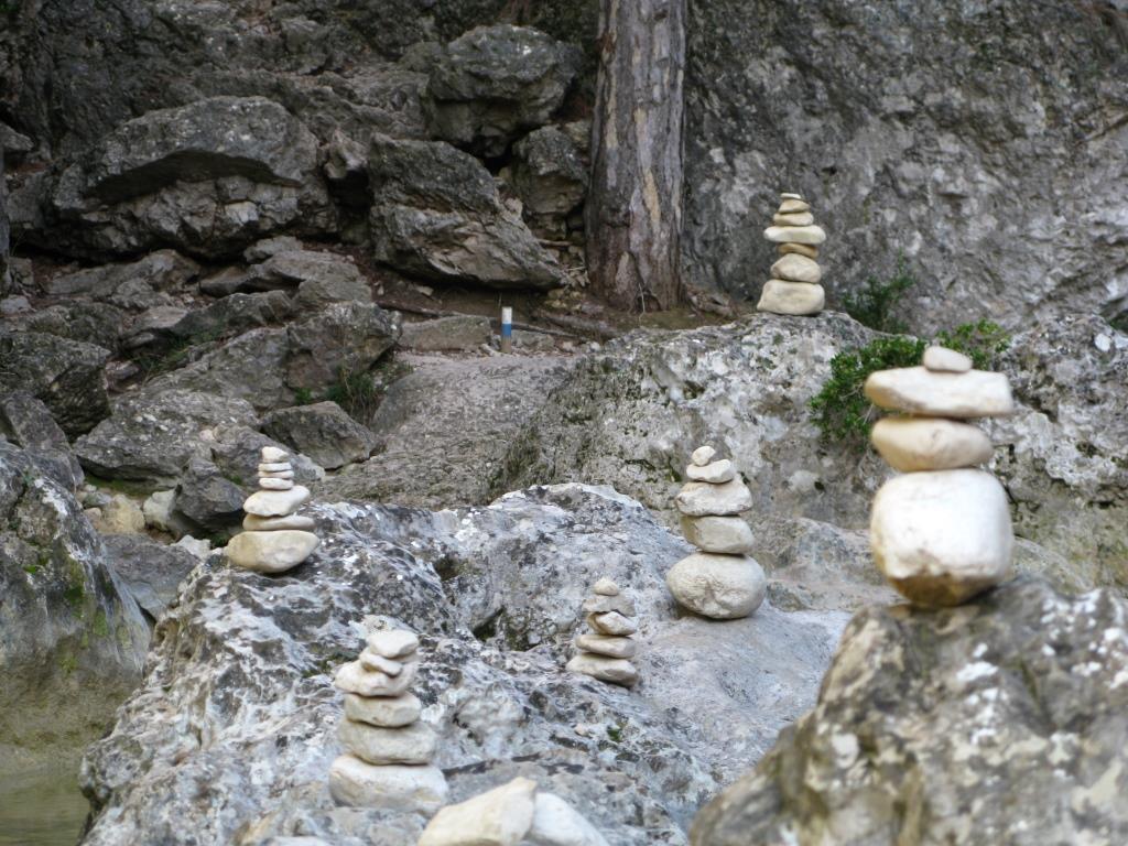 Km. 6,6 – Bifurcació. Cartell indicador. Abandonem el G.R. (vermelles i blanques) i prenem el camí descendent de la nostra esquerra que transita a l’inici per una mena de pista en desús ja molt tancada. De nou trobem marques de P.R. (grogues i blanques). Al poc el camí es fica a la part baixa de la torrentera, coincidint sovint amb el llit sec de la mateixa.