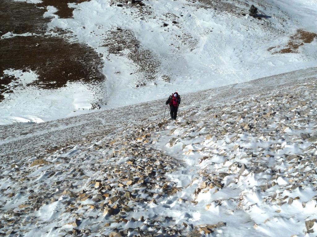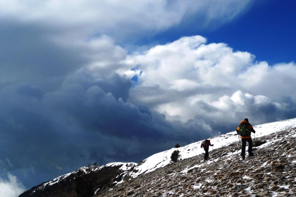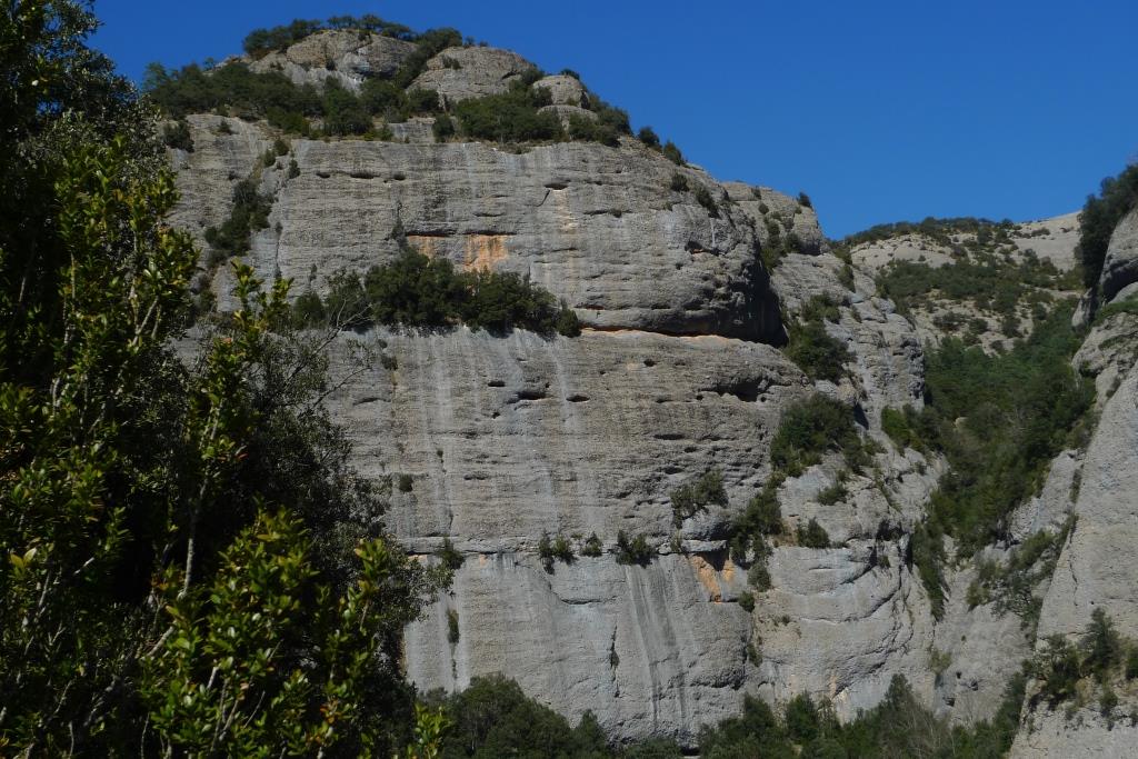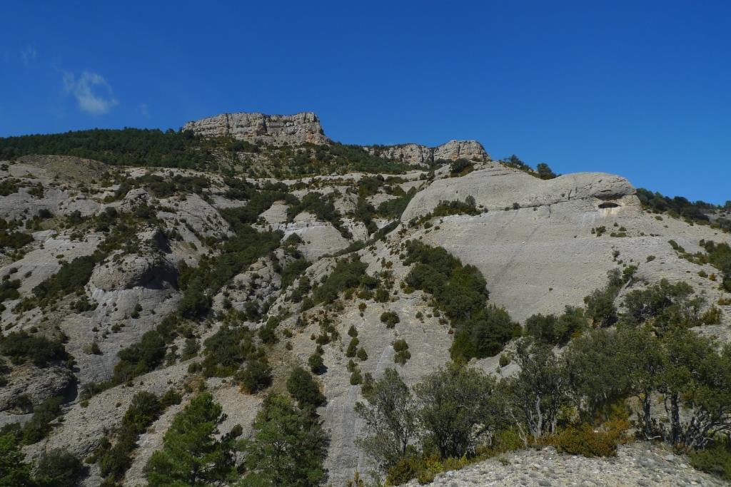 Km. 1,6 – Traspassem una aresta i ens situem al vessant soleia de la muntanya. Pugem vers a l’est per aquest vessant orientat a sud. Ziga-zagues. Marques de P.R.