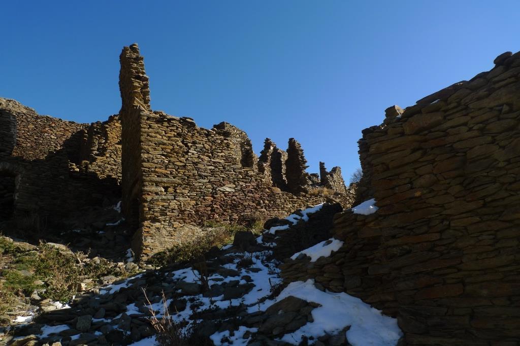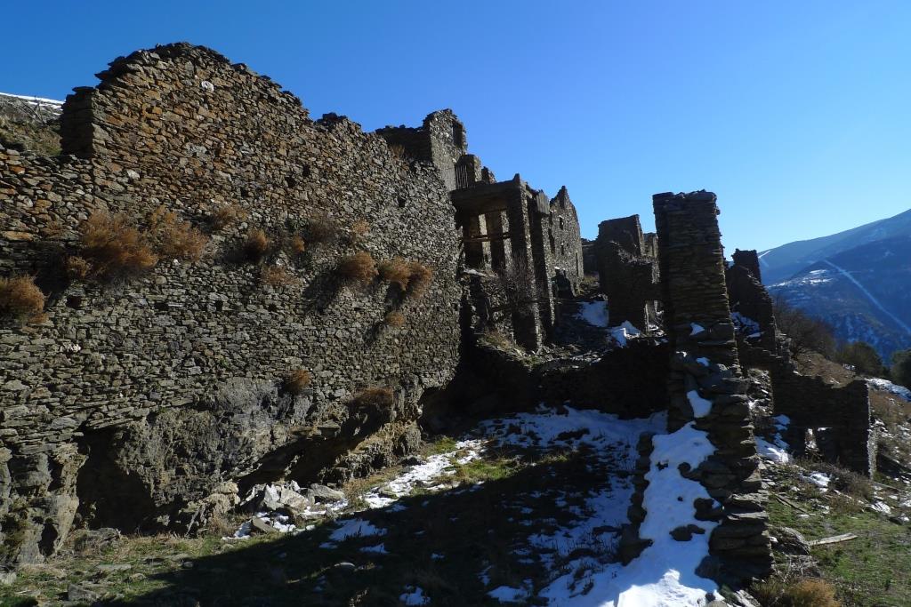 Sant Joan de l’Erm Vell. Quatre ruïnes congelades, resta del que antany va ser un lloc local de pelegrinatge i devoció. Ara Sant Joan de l’Erm Nou ha eclipsat el protagonisme d’aquest paratge històric. Sant Joan Nou (lloc pel qual no passem) és un dels principals centres d’esquí de fons dels Pirineus, ben comunicat, amb un gran i còmode Refugi – hostal. Sant Joan Vell va ser centre religiós i hospital militar durant la guerra civil. Després del conflicte armat va caure en una galopant decadència. Ara només són ruïnes d’un color marró viu, gairebé vermellós, que creen un viu i atractiu contrast de color sota el blanc nuclear de la neu. Tancant l’horitzó, ondulades i imponents muntanyes de més de 2.000 metres d’altura serveixen de teló de fons. Blanques, immaculades, virginals …. Com tot el que ens envolta. El blanc letargia de la dama de l’hivern. Un somni de vidre, fred, gèlid i fràgil. La dama blanca sense calor humana. Crissss, crasssss, crissss, crasssss. El camí fa baixada. Avui dormim a Montenartró. Un poble situat al vessant nord de la muntanya, on les ombres i el gel cristal·lí i blau han colonitzat les escassíssimes carrers. Només dues cases es mantenen vives tot l’any, i una d’elles és just la que ens farà de Refugi: l’Abadia de Montenartró.