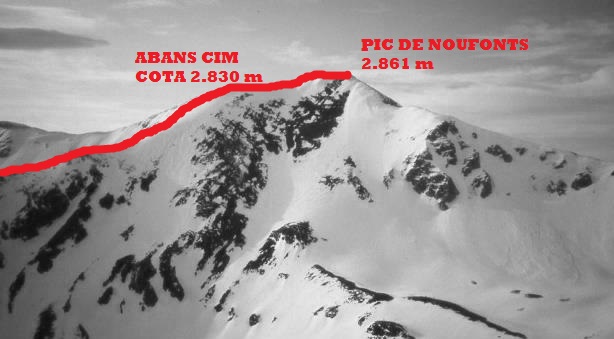 Una vegada que som a l’aresta en qüestió, més enllà dels 2.600 metres, punt d’unió de les dues alternatives d’accés descrites, pugem pausadament per aquest ample llom. Guanyem un promontori rocós format per la unió de l’aresta N.E. amb l’aresta cimera del Noufonts. Passant la torreta de blocs només resta caminar uns quants metres i ja som al Pic de Noufonts, 2.861 metres.