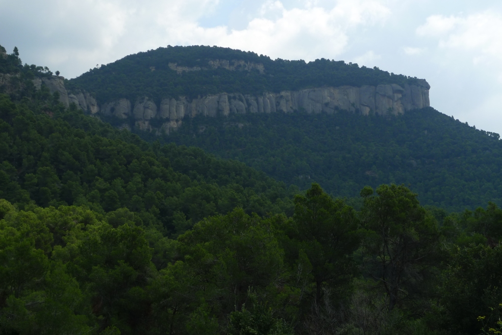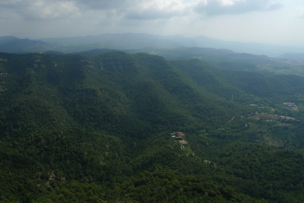 El segon dia ja vaig poder gaudir del verd del bosc de Collserola. Després del jorn entre edificis aquestes muntanyes semi urbanes em semblaven frondoses i mig salvatges. Vaig gaudir fins i tot del primer xàfec de la travessa, sabent que gràcies a ell les temperatures es veurien una mica frenades durant unes poques hores. Al finalitzar la pluja la relativa fresca va passar a dir-se xafogor i poc mes tard el Sol canicular em recordava de nou com d’estiuenc es el mes de juliol a plena plana del Vallés. De nou asfalt per travessar Sant Cugat del Vallés i Terrassa, intercanviant el paisatge amb zones de bosc prou amples, tot seguint l’intel·ligent traçat del camí dels monjos. Després d’un sopar entaulat a Matadepera la nit em va sorprendre a les proximitats del Pic de la Mola, al Parc de Sant Llorenç de Munt. Calorosa nit al Pla dels Escorpins, amb espectaculars vistes nocturnes sobre les il·luminades ciutats del Vallès. Imaginàriament traçava la llarga línia d’aquest segon dia de marxa, sabent que, definitivament, les zones urbanes més grans de la travessia ja havien quedat enrere.